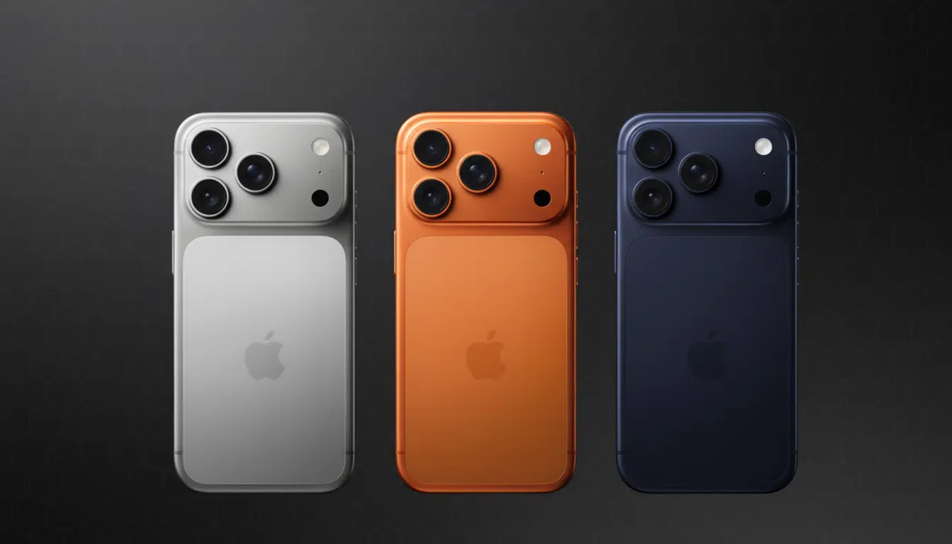 Three smartphones, silver, orange, and blue, are lined up on a dark background with a subtle hexagonal pattern, showcasing their rear cameras and Appl