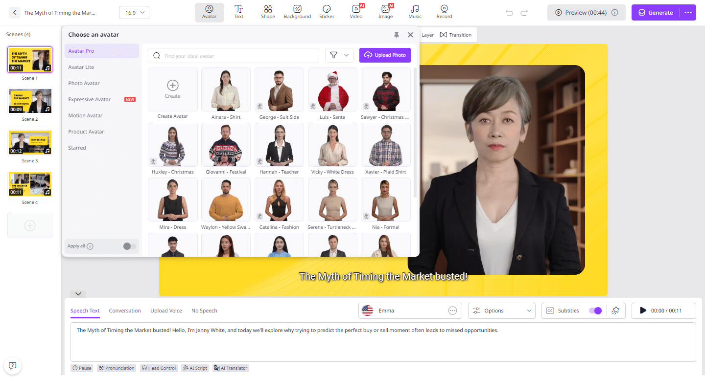The platform includes more than 1,900 realistic avatars representing various professions and roles, such as educators, customer support agents, presenters, executives, and students. For faster setup, users can create a digital version of themselves using Avatar Lite, while Avatar Pro allows for more advanced customization.