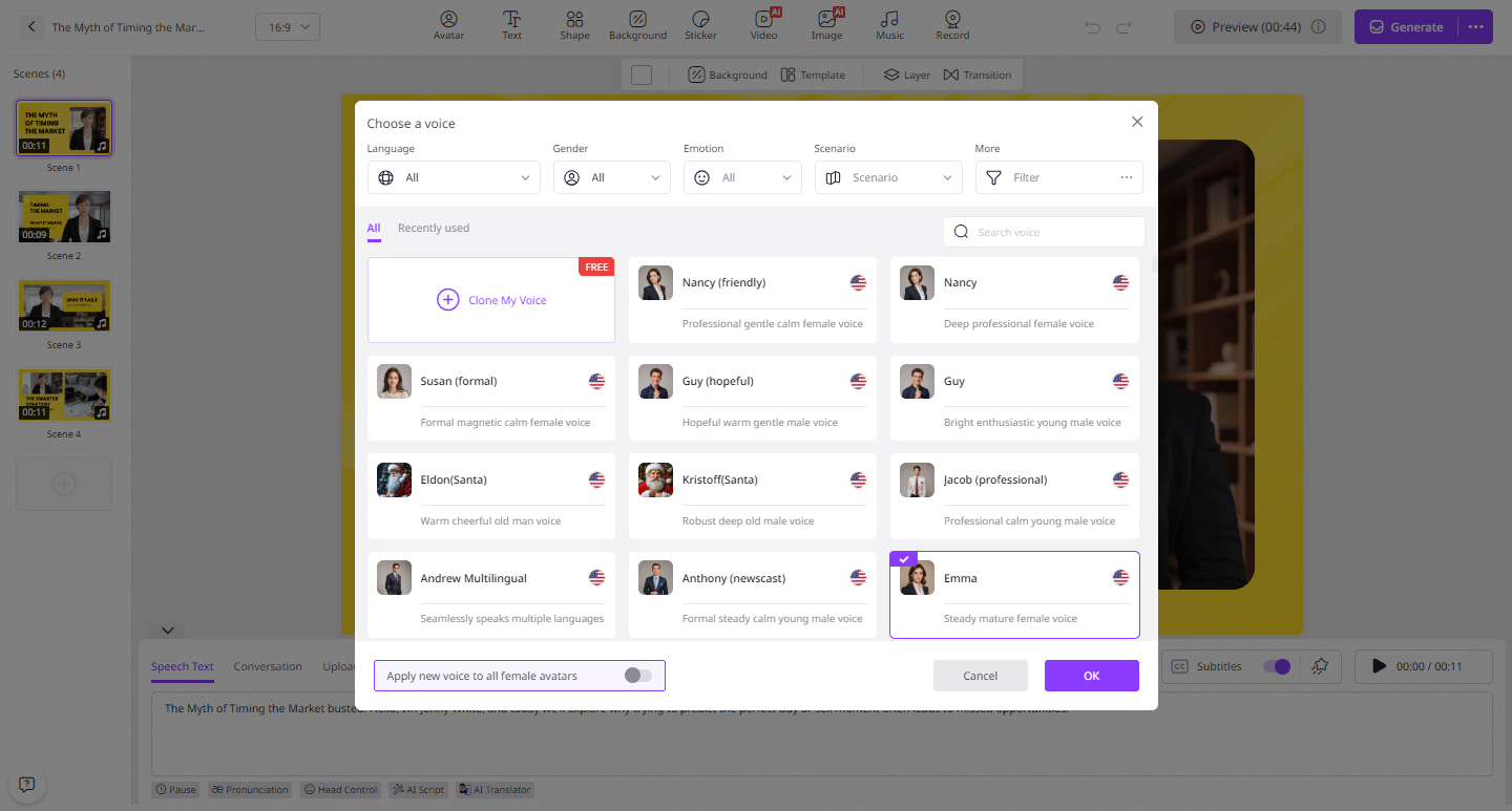 - Enter your script and choose an AI voice. You can also change the video language, with support for over 140 options.