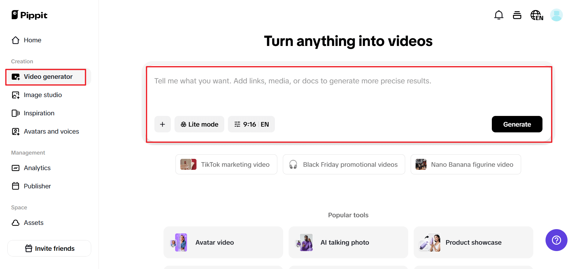 Head to Pippit to get started. Create a new account, then select Video generator. You can paste your product link for auto-fetching, or you can click on Add media manually to upload clips or images. Add your product highlights, then click More information to select your target audience, add your logo, and finally hit Generate to get your first trend-ready intro draft.