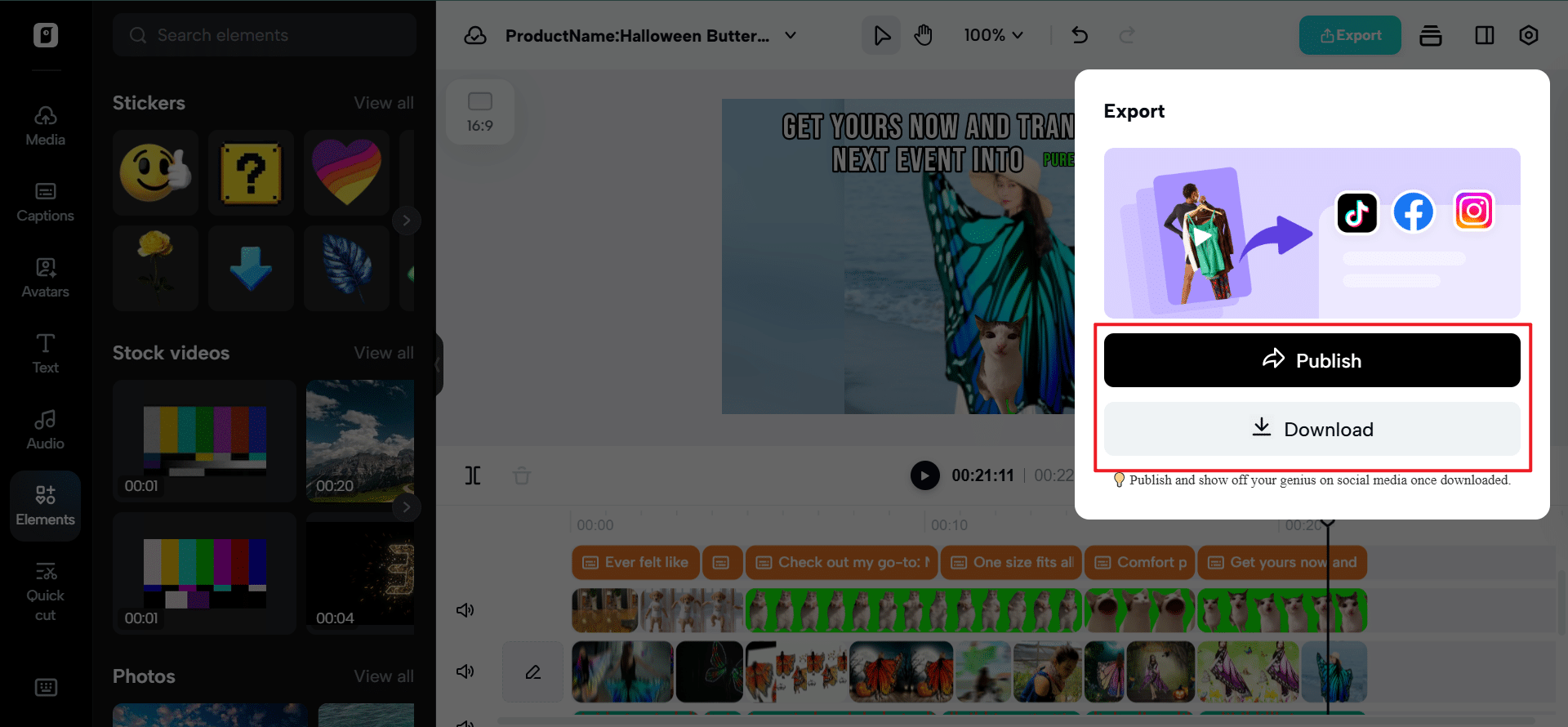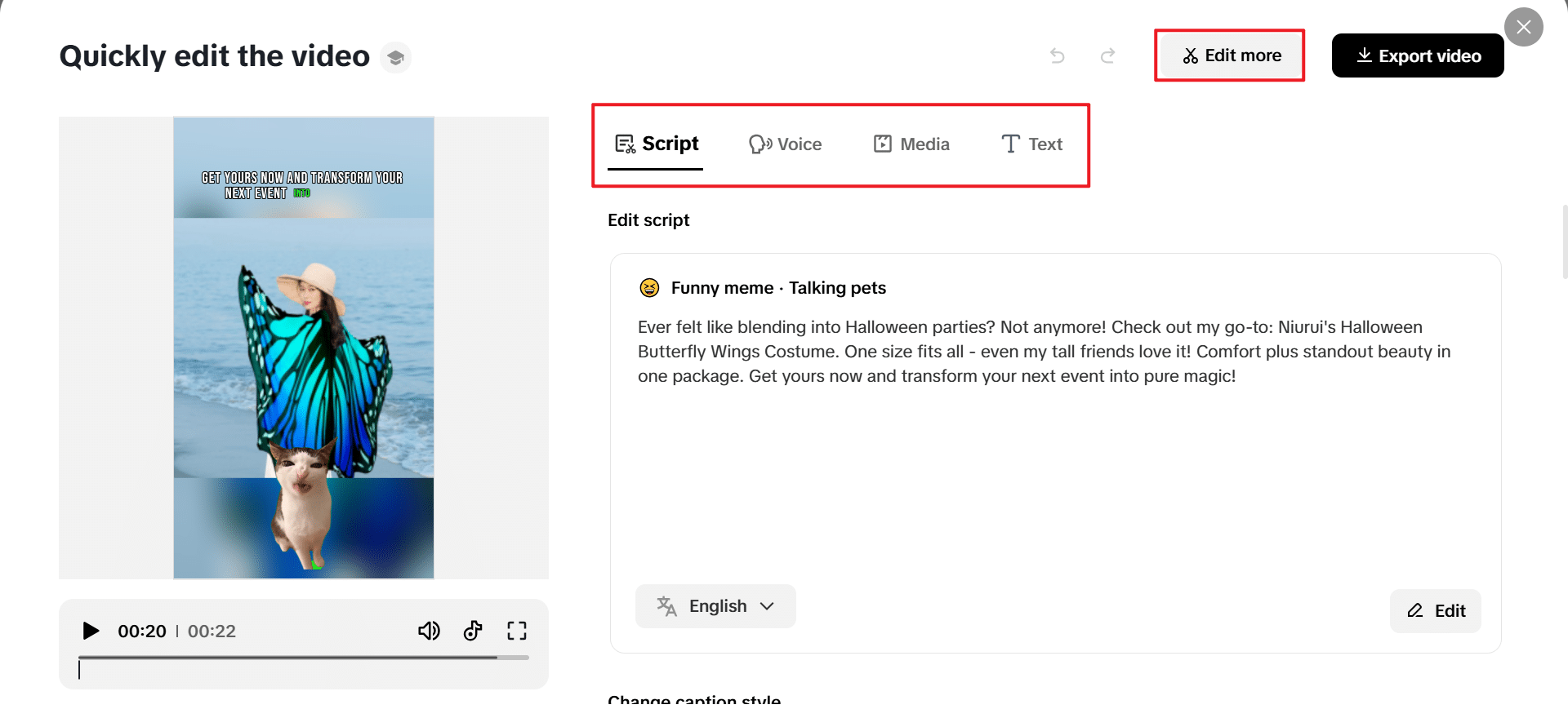 Now, select your created intro and click Quick edit. Refine the pacing: adjust caption styles, rewrite the script for a different tone, choose the character of your voiceover, or test avatars that match your vibe. For more detailed control, click Edit more to merge the intro with your complete video, add transitions in TikTok or Reels style, and lock in the YouTube-standard 16:9 aspect ratio.